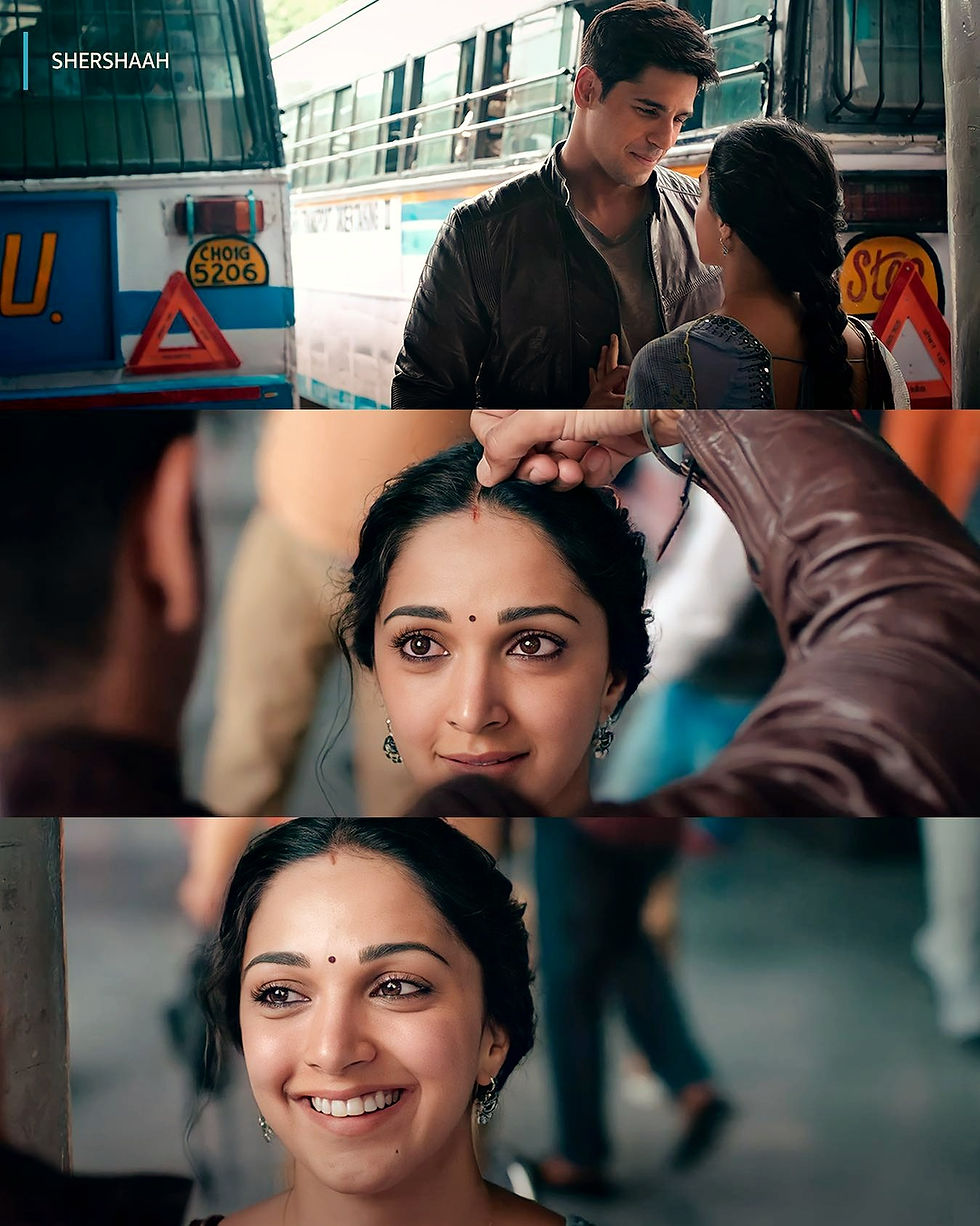 Before leaving for his duty again, Captain ensured that he spent some quality time with his partner. When they had once gone to the temple, he secretly held Dimple's dupatta, without letting her know, and took four rounds in the Gurudwara. If we go by the Sikh religion, this is not just a charming act, but also the way to getting married. This meant that both of them were married to each other! And on hearing this from the Captain, Dimple's face lit up with a priceless smile - one that would make emotionally attached people like me want to cry (I actually did cry, I felt so touched by Captain Vikram's gestures for Dimple, they were very endearing). Right before heading the train, we see that the Captain performs another pleasing gesture, yet again. He told Dimple that he wanted to marry her the Hindu way, too, and right that moment, grabbed a blade from his pocket. He quickly made a small cut on his thumb and he used the blood to add what is popularly known as 'sindoor' to Dimple's forehead. That was one of the most unforgettably dreamy moments ever. Captain Vikram seemed to be the most romantic guy ever, never failing to come up with one thing or the other to make not just Dimple, but even the audience when we saw him, fall in love with him more and more. These lovely romantic gestures made the love story even more loveable for the viewers, making us falling in love with the idea of being in love! Their love story arouses this certain hope of finding love, it's so cute! I feel like Vikram was such a special guy, that words are genuinely too less to describe him. Seeing Sidharth Malhotra play him was an added bonus, and it made me feel like Captain Vikram was one of those one-in-a-million romantic guys. His character gave off dreamy fictional character vibes - and I loved that! He was such a thoughtful and charismatic man that I couldn't believe that he was an actual person and not a perfect fictional character from some best-selling novel. What Dimple shared with Vikram was so special that even if she wanted to, she probably wouldn't have found it again anywhere else. In my humble opinion, I somewhere feel that this is the reason why Dimple chose to remain unmarried. It was not just out of respect, but out of such immense love for Vikram that she probably felt she wouldn't have found anywhere else; and I can completely comprehend where she's coming from, the movie says it all, rather, shows it all. This is what I love about such movies - they show, don't tell - and, that's what captivates me and grabs my attention.